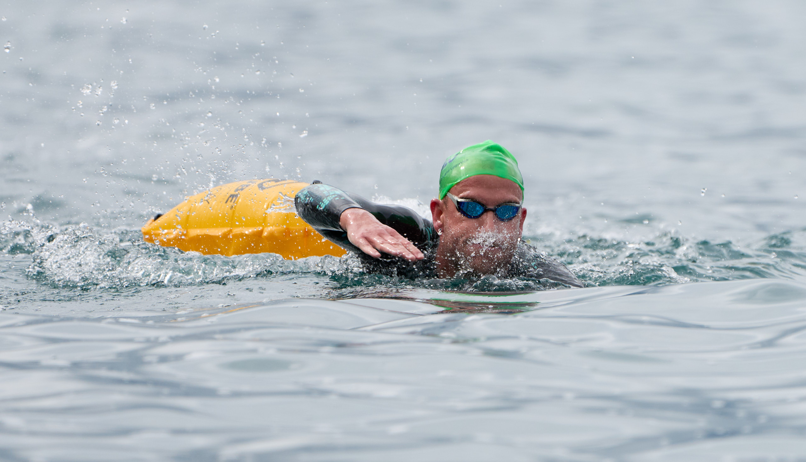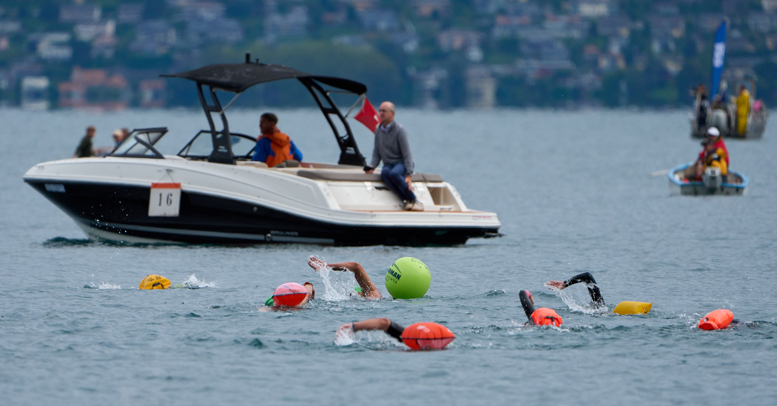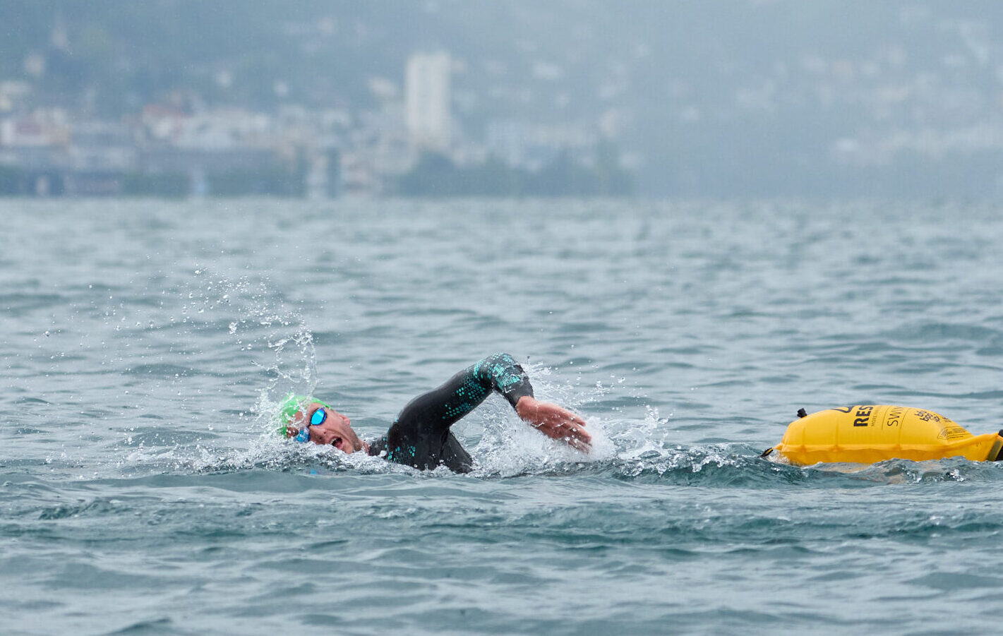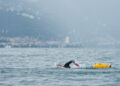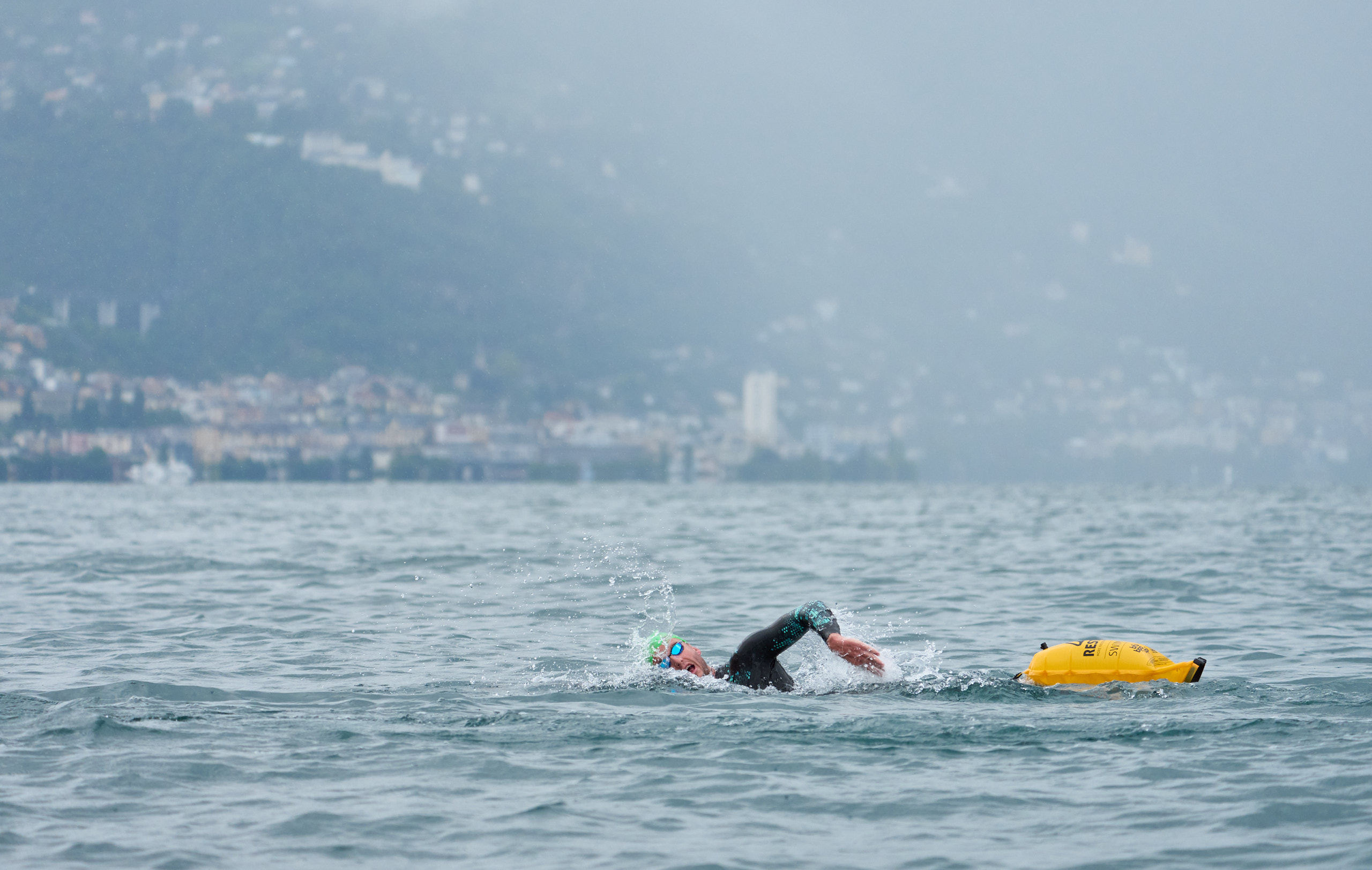 Damien Joly, en tête de la traversée du lac en face de Montreux sous la pluie